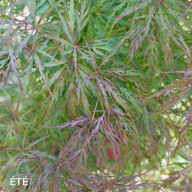 Feuillage fin découpé. De couleur rouge-pourpre au printemps, il verdit légèrement en été. En automne, il devient rouge feu.