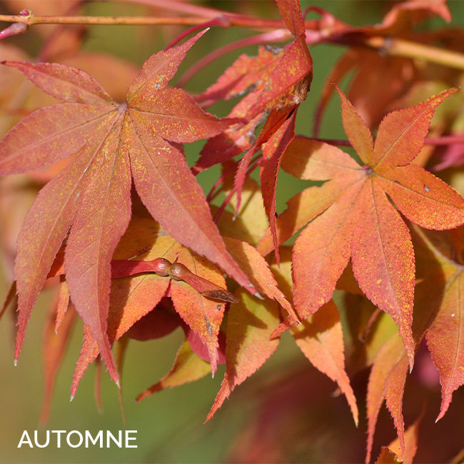 Larges feuilles, de couleur verte au printemps, passant par différents coloris, jaune, orange vif à rouge carmin en automne.