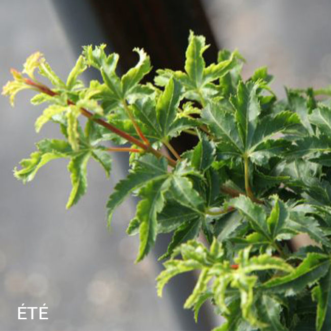 Petites feuilles dentelées crispées, de couleur vert tendre au printemps puis vert foncé en été, prennent une coloration orangée rouge feux en automne.