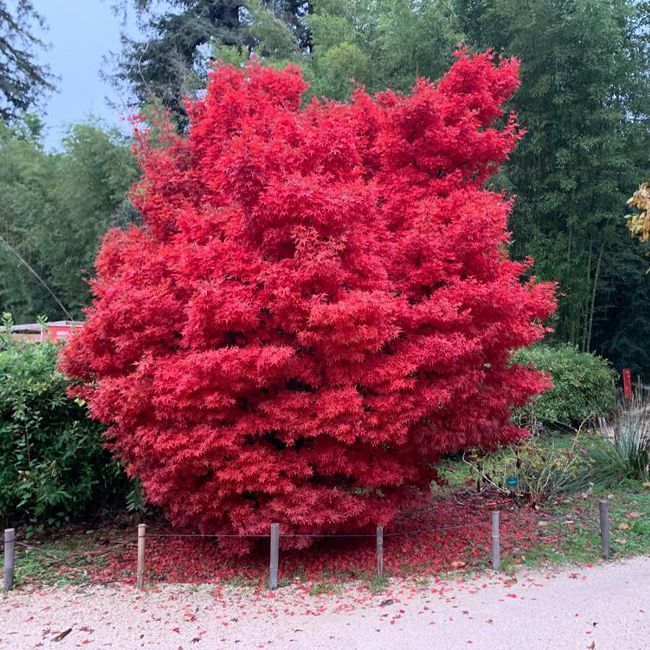 Les jeunes feuilles sont rouge au printemps et en été deviennent vertes foncées avec parfois des repousses rouges. Dès l’automne, elles deviennent rouge bronze. Son port est trés compacte.