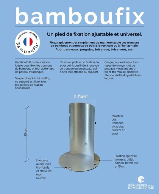 Bamboufix® est la solution idéale pour fixer les tronçons de bambous et tout autre type de poteau cylindrique. Simple et rapide à installer, ce support est livré avec les colliers de fixation nécessaires. C’est une platine de fixation en acier peint, destinée à recevoir un tronçon ou un poteau, qui devra être attaché au support. Au choix, deux types de fixation s’offrent à vous : Bamboufix® peut être planté et maçonné ou bien fixé sur un support rigide. Conçu pour maintenir tous types de tronçons et de poteaux mesurant entre 60 et 110 mm de diamètre, Bamboufix® est ajustable en largeur.